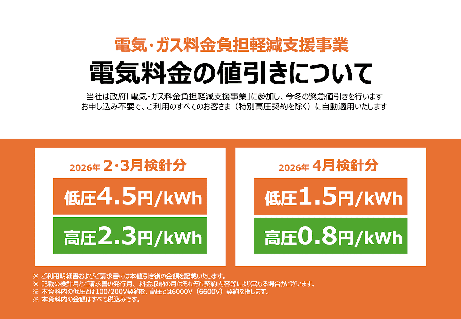 当社は、政府の電気・ガス料金支援「電気・ガス料金負担軽減支援事業」へ参加し、お客さまへ下記のとおり値引きを行います。